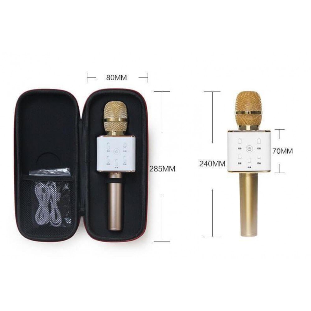 Bluetooth микрофон для караоке Q7: Bluetooth 4.0, двойной динамик, эхо + реверберационные эффекты, 2600 мАч батареяС таким микрофоном так легко почувствовать себя звездой сцены на вечеринке в кругу друзей, а еще вдвойне приятнее репетировать у зеркала очередную триумфальную речь, воображая себя на церемонии награждения «Грэмми» (или еще какой-нибудь премии), пока никто не видит.Микрофон не только круто выглядит, но и радует функционалом: Bluetooth 4.0 для соединения со смартфоном или планшетом, звуковые эффекты, встроенный аккумулятор, которого хватит, чтобы любимые соседи 5 часов подряд наслаждались вашим певческим талантом и не пропустили ни одного тоста, произнесенного тамадой на шумном застолье.Ваш ребенок любит петь? Развлекает Вас и родственников своим пением? Смотрит Голос Страны и видит себя настоящим артистом?Подарите ему возможность уже почувствовать себя звездой сцены!Приобретая Беспроводной микрофон караоке bluetooth Q7, возможно Вы сделаете первый шаг к осуществлению мечты юного артиста. Ведь с беспроводным микрофоном караоке bluetooth Q7 Ваш ребенок сможет исполнять любимые песни везде и всюду, тренироваться, улучшая свои навыки.Мульти-функциональный беспроводной микрофон поддерживает большинство специальных программ на телефоне, планшете и компьютере. Персональное караоке в любом месте в любое время!Характеристики:• Bluetooth• Количество динамиков: 2• Мощность: 3 Вт *2• Диапазон частот: от 100 Гц до 10 кГц• Максимальное звуковое давление - 115 дБ 1KHz• Коэффициент нелинейных искажений: < 1 %• Регулировка: Treble, Bass, Volume, Music, Echo• Источник питания: встроенный литий-полимерный аккумулятор• Емкость батареи: 2600 мАч (заявлено производителем)• Время работы аккумулятора: от 6 до 8 часов (заявлено производителем)• Питание: DC 5V• Металлический корпус• Вес: 470 г• Размер: 25 см• Ширина: 7,3*7,3см и диаметр 3 см• Цвет: розовый, черный• Разъемы: MicroUSB и USBКомплектация:- Микрофон Q7- Кабель USB на microUSB- Инструкция- Чехол!