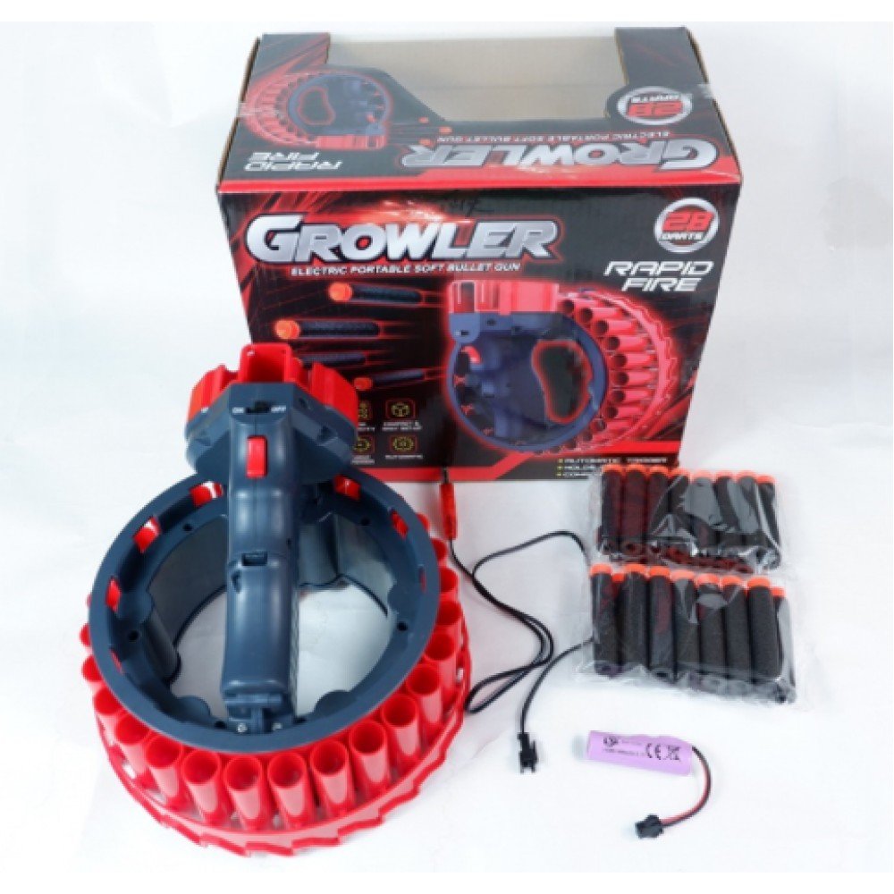 Детское оружие автоматический Бластер пулемет Growler не оставит равнодушным представителей мужского пола всех возрастов!Бластер пулемет представлен в виде рукоятки с патронным барабаном. На рукояти находится 2 кнопки управления: ВКЛ И ВЫКЛ для запуска стрельбы, поэтому пользоваться оружием очень просто. Для начала необходимо вставить до упора (!) 28 патронов в ячейки барабана, включить бластер, снять предохранитель, прицелиться и нажать кнопку пуска!Мультибластер автоматически начинает стрелять со скоростью несколько пуль в секунду. поражая вашу цель на расстоянии до 10 метров! Мягкие пули с присосками безопасные и не наносят ущерба ни здоровью, ни окружающим предметам.За счет съемного аккумулятора бластер обладает большей мощностью и с легкостью крутит барабан в отличии от моделей на батарейках. Время работы 30 минут, время заряда 20- 30 минут. Бластер Growler наполнит активные игры ребенка максимальной радостью и восторгом!Детское оружие представлено в виде рукоятки с барабаном. На рукоятке находится 2 кнопки управления : вкл-выкл и запуск стрельбы, поэтому использовать его легко и просто. Для начала нужно вставить 28 патронов в ячейки барабана ,включить бластер ,снять с предохранителя ,прицелиться и нажать кнопку спуска.Мультибластер начинает автоматически стрелять поражая вашу цель на расстоянии до 10 метров.Время работы аккумулятора до 30 минут ,время заряда 20-30 минут.Преимущества: - игра безопасна, подходит для малышей и взрослых- безопасные, легкие патроны- съемный аккумулятор- быстрая зарядка Характеристики:Тип: ПулеметВозраст: от 6 летТип боеприпасов: Мягкие пулиТип питания: Аккумулятор Комплектация :-бластер-28 патронов-провод для зарядки аккумулятора-аккумулятор