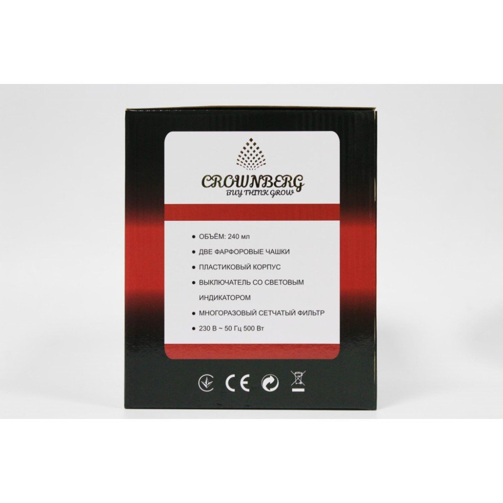 Капельная кофеварка Crownberg CB 1568 600Вт — выручит Вас ранним утром и сэкономит время на приготовление любимого кофе. Всё очень просто - подставьте любимые чашки и нажмите на кнопку через 2 минуты наслаждайтесь ароматным кофе.Особенности капельной кофеварки Crownberg CB-1560 на 600 Вт: Кофеварка Crownberg CB-1568 проста в использовании и не требует особых навыков. Простота в использовании: Налейте воду, по своему вкусу, с помощью мерной ложки добавьте кофе и просто включите. Компактность и удобство. Кофеварка изготовлена из пищевого пластика, который легко моется и ударостойкий. Чашки стоят на антискользящей поставке, которая еще и снимается, для мытья, если вдруг, случайно пролился кофе. Характеристики: Напряжение: 220-240 В Мощность: 600 Вт Легко чиститьКомплектация Кофеварка 2 чашки( по 140 мл.) Инструкция Заводская упаковка