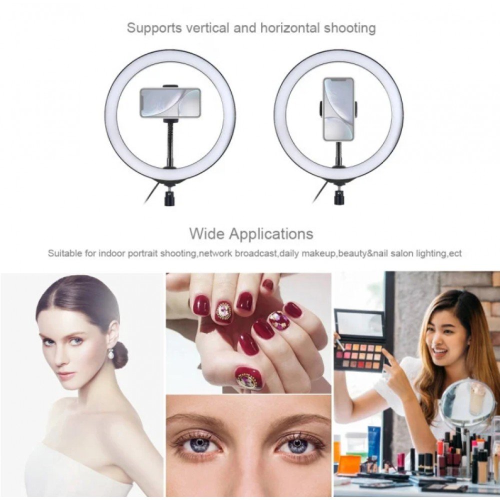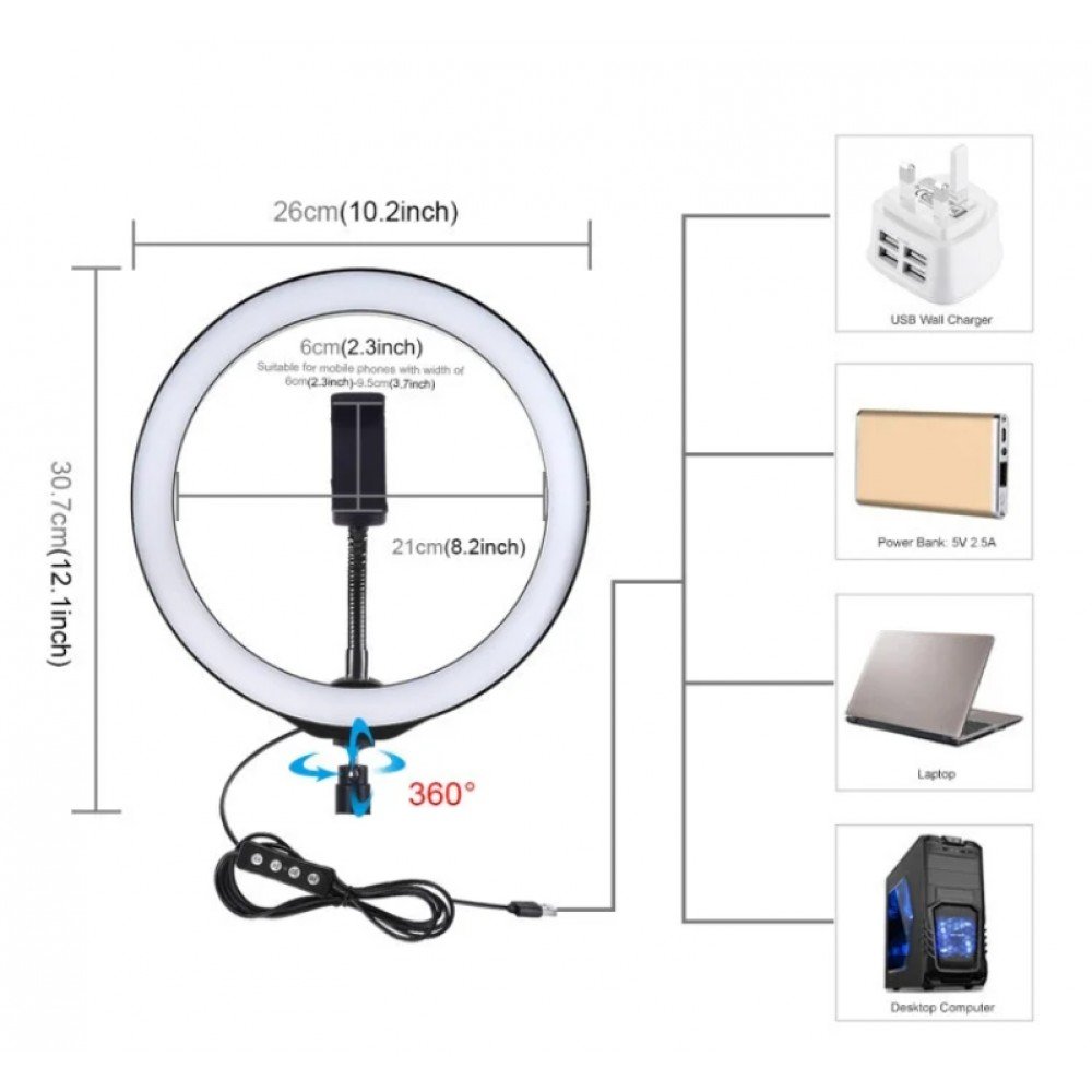 Кольцевая светодиодная Led лампа Ring для блогера / селфи / фотографа / визажиста D 26 смКольцевая лампа для фото и видео съемки - это доступное профессиональное освещение для фото и видео съемки, детальной съемки, дополнительного освещения. Качественный профессиональный кольцевой свет.На сегодняшний день, все больше мастеров использует данный продукт в своей работе. Данная светодиодная Led лампа будет просто незаменима для лэшмейкера, тату-мастера, визажиста, косметолога, блогера и др. Характеристики:Область применения: мобильная фото- и видео-съемка, детальная съемка, дополнительное освещениеМодель: (Led Ring Fill Light with Control)Совместимость: смартфоны, видео и фото камерыЦветовая температура: 5500K - 3200КПитание: Usb 5V, 2AДиаметр кольца: 26 смКомплектация:1 - Кольцевая лампа2 - Держатель для телефона3 - Шаровая головка для штатива