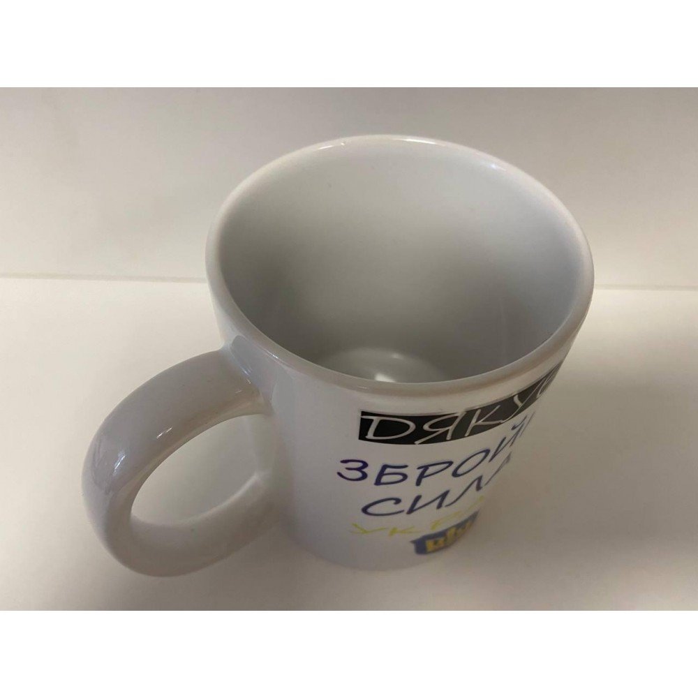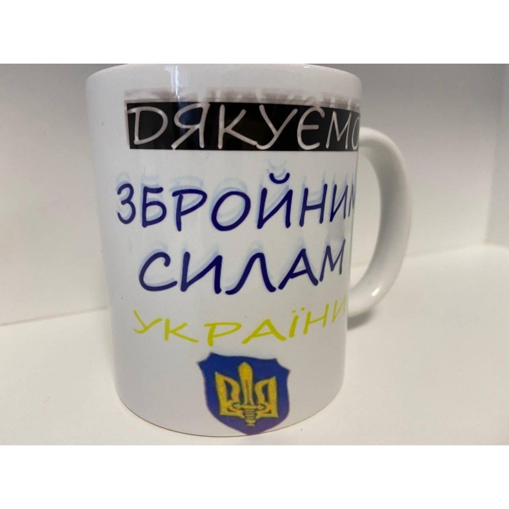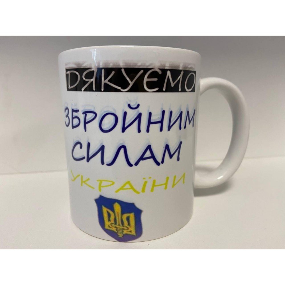 Кружка с принтом "Дякуємо Збройним Силам України" керамическая, 330 мл, кружка с патриотичным принтомГлавное о кружке: материал - керамика; способ нанесения надписи - сублимация; объем - 330 мл; назначение - для чая, кофе, воды и других напитков.