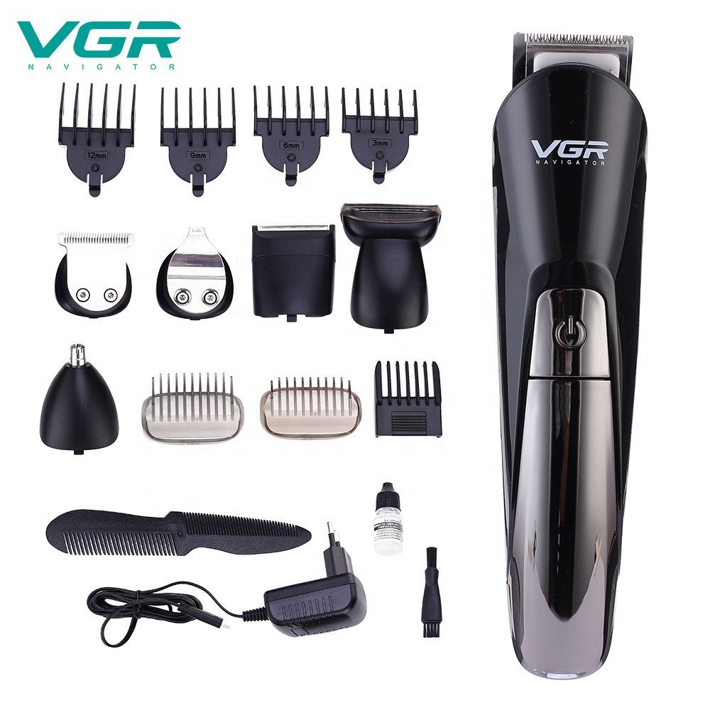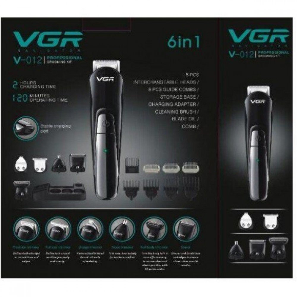 Многофункциональный Триммер набор для стрижки волос и для бритья и носа VGR V-012 6 в 1 Чёрный (V012)Электрическая бритва и машинка для стрижки VGR navigator V-012 оснащен насадками, которые предназначены для ухода за вашей бородой, головы и в других частях тела. Универсальный прибор 6в1 позволит с легкостью создать и поддержать стиль. Две насадки для стрижки разной ширины, насадки регулировки длины 3-12 мм, триммер для носа, дизайнерский триммер, узкий триммер, сеточная бритва, насадка 3-4,5 мм.Благодаря насадкам идеальная щетина и борода получаются при использовании этого полноразмерного триммера. Идеально гладкую кожу обеспечит бритва с сеточкой. С поворотным триммером вы с легкостью избавитесь от ненужных волосков в носу или ушах. Такая насадка, как гребень для бороды, позволит ухаживать за бородой.Лезвия прибора выполнены изстали с закругленными кончиками. Они не травмируют кожу лица и шеи при работе. Прибором можно пользоваться в душевой, а благодаря водонепроницаемому корпусу ополаскивать его под краном.Характеристики профессиональной машинки для стрижки волос VGR V-012 Тип: машинка для стрижки Основная часть корпуса: металлическая Мощный LI-ION аккумулятор. Работает как с подключением к сети, так и без Шнур: 2,5 м Время работы без подключения к сети: до 120 минут Время зарядки: до 2 часовПроизводитель профессиональной машинки для стрижки волос V-012 – тм VGR (Китай).Комплектация: Триммер 6 насадок 8 гребней Адаптер питания 220 В Кисточка для чистки Расческа Масло Подставка