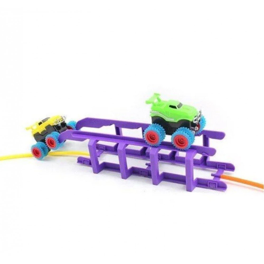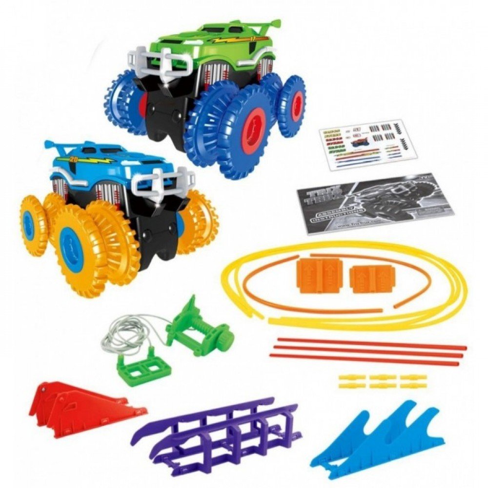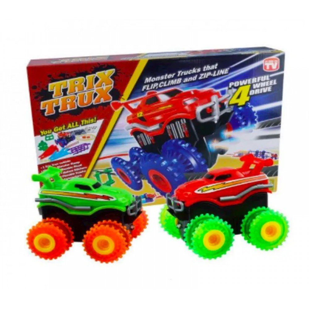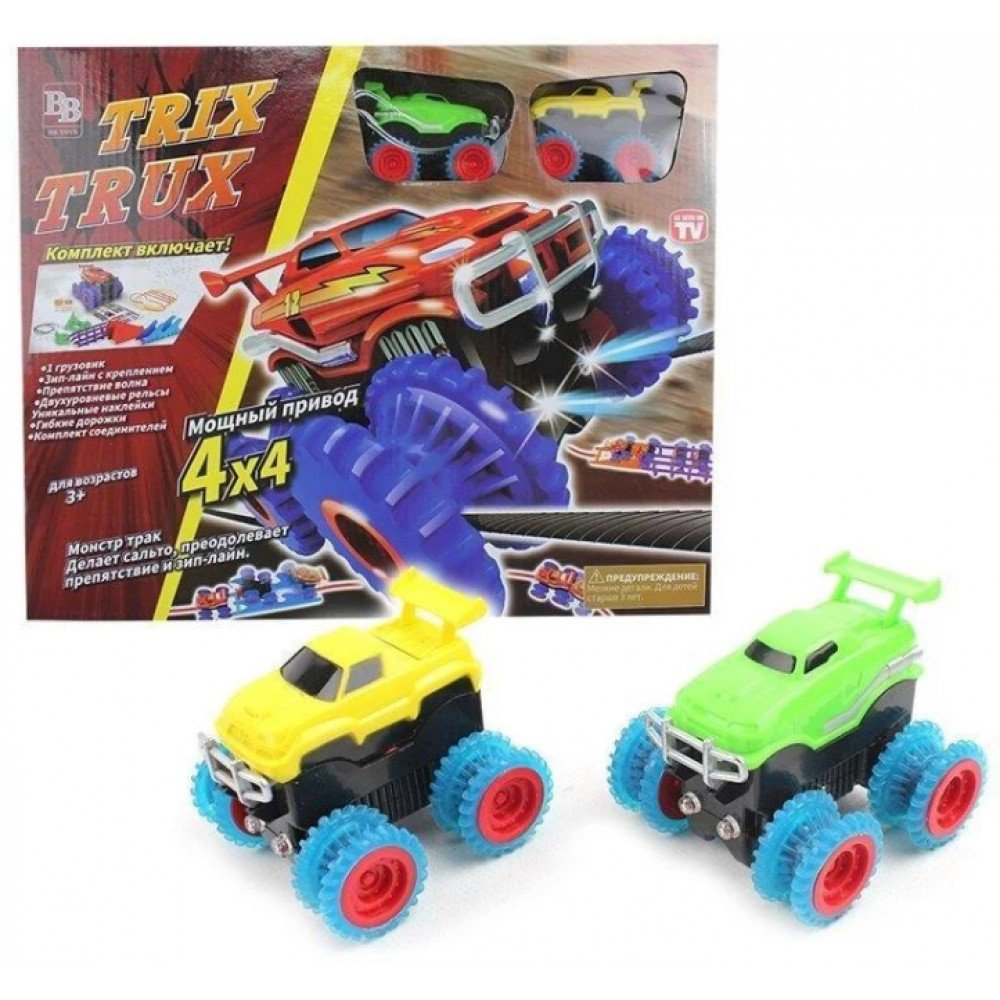 Монстр трак популярный игрушечный трек Trix Trux 1938 (2 машинки)!Trix Trux - это популярный игрушечный трек, который будет интересен как детям, так и взрослым. Игрок может самостоятельно создавать и комбинировать препятствия. В итоге вы можете смоделировать сотни вариантов трассы и провести знаменитую машинку монстр-трак по воздуху и даже на двух колесах!Простая сборка трассыТрассу под силу собрать ребенку даже 3-летнего возраста! Играть можно как самому, так и в компании друзей, устраивая при этом соревнования. Машинка Trix Trux ездит на 2 колесах!Машинка Trix Trux - это полноприводный автомобиль, который пребывает в постоянной готовности форсировать препятствия и неровности поверхности благодаря большим колёсам.Машинки монстер-трак настолько устойчивы, чтобы продолжают движение в перевернутом состоянии, совершают акробатические трюки на препятствиях, могут ехать под горку. Если натянуть трос в воздухе, то монстр-трак проедет по нему, балансируя на 2 колесах и даже в перевернутом виде! Прочные пружины и литой корпус делают машинки надёжными и долговечными.Особенность набора Монстр Трак:· Самостоятельное моделирование трассы;· Полное управление машинкой;· Машинки могут ездить на двух колёсах;· Trix Trux выполняют акробатические трюки;· Монстер-трак ездят вверх ногами;· В игру можно играть одному или с друзьями.Полная комплектация - все, что нужно для игры1. Машинка биг-фут Trix Trux; 2. Гибкая трасса и специальные удобные защелки 3. Трамплин «волна»; 4. Трамплин «горка»; 5. Элемент для преграды «лестница»; 6. Струны, предназначенные для трюков в воздухе. 7. Наклейки, с помощью которых можно украсить авто