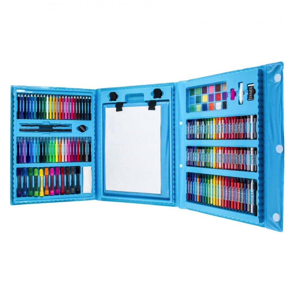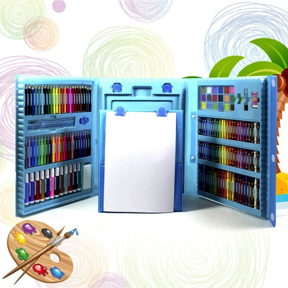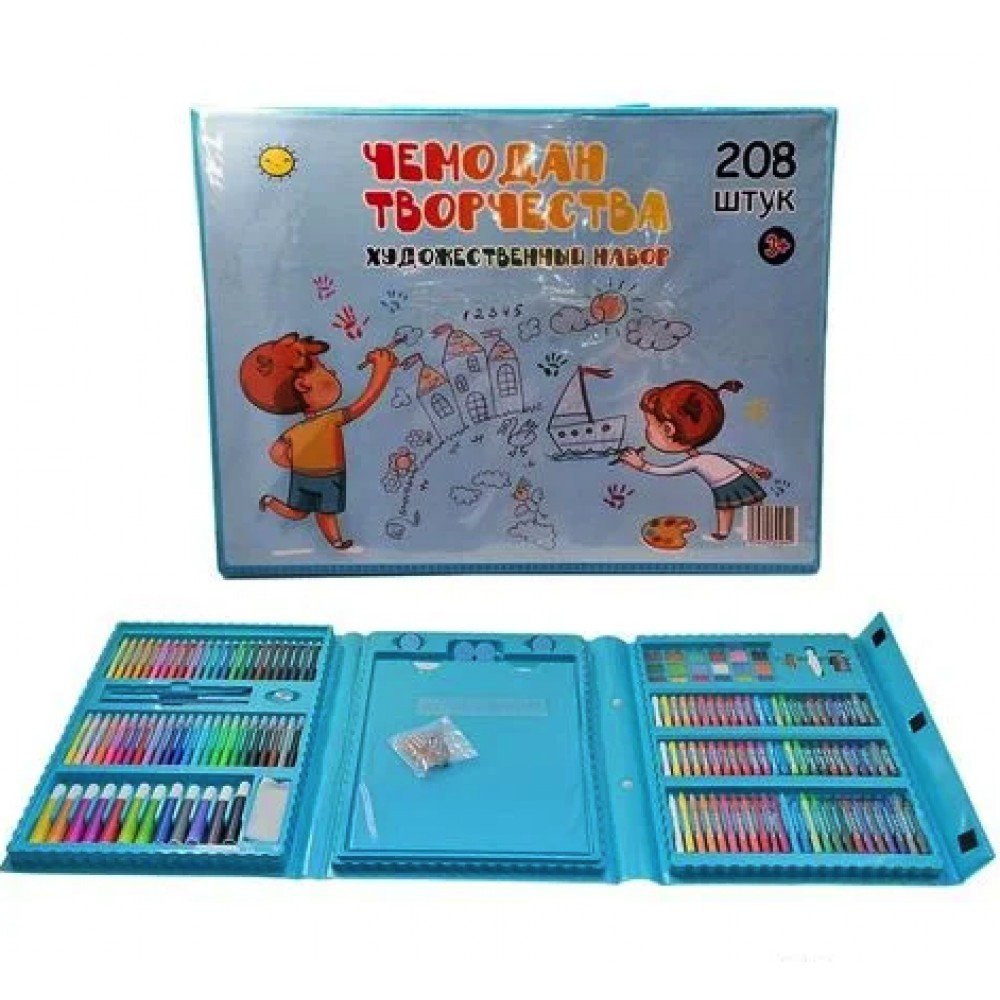 Детский набор для рисования на 208 предметов - прекрасный подарок для ребёнка. Набор для рисования в чемоданчике 208 предметов подарит Вашему ребенку море положительных эмоций. Любовь к различным аксессуарам для рисования, раскрашивания и отражения собственных фантазий на бумаге, проявляется у всех детей, начиная с самого юного возраста. Чемоданчик в виде раскладного кейса продуман до мелочей. Он имеет ячейки, которые хранят в себе все самое необходимое для маленького художника. Каждый предмет сложен в свою ячейку, а это значит, что все будет под рукой и никогда не потеряется. В сложенном виде кейс напоминает чемоданчик, который легко можно использовать как дома, так и в дороге. Кейс раскладывается просто, как книга. Компактный чемоданчик превращается в полноценное удобное рабочее место юного художника. Чемоданчик для рисования удобно хранить и брать с собой. Преимущества: Набор для рисования в чемоданчике; Приучает к аккуратности и дисциплине, улучшает мелкую моторику рук, тренирует внимательность; Практичный и прочный чемоданчик для безопасного хранения и перемещения; Ячейки набора эргономичны – группы предметов разделены на секции; Этот мобильный художественный набор понравится не только детям, но и их родителям; Набор юного художника для детского творчества станет отличным подарком для детей;Характеристики: Назначение: набор для творчества; Вес: 2.2 кг Комплектация: 208 предметов Цвет: Голубой.Комплектация художественного набора: 12 толстых фломастеров; 24 тонких фломастеров; 48 пастель масляная; 24 цветные мелка; 24 цветных карандаша; 18 акварельных красок; 15 листов для рисования; 30 скрепок; 4 зажима для мольберта; 1 простой карандаш; 1 ластик; 1 точилка; 1 палитра; 1 клей; 1 линейка; 1 кисточка; 1 губка; 1 мольберт для рисования.