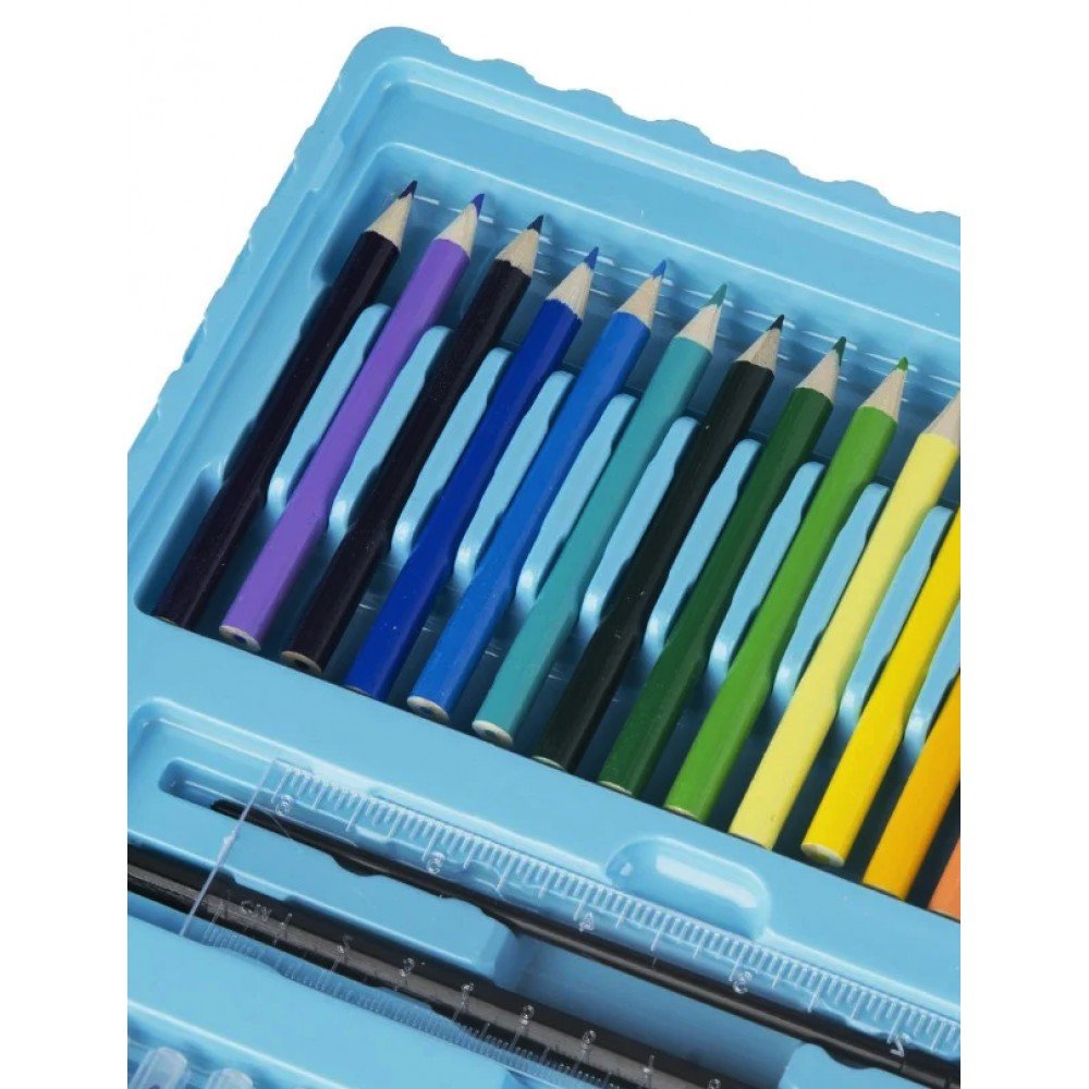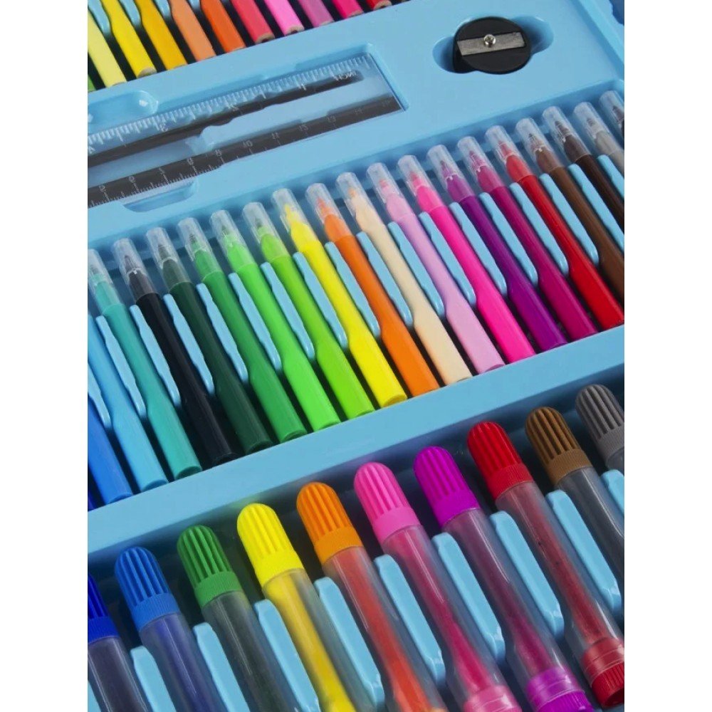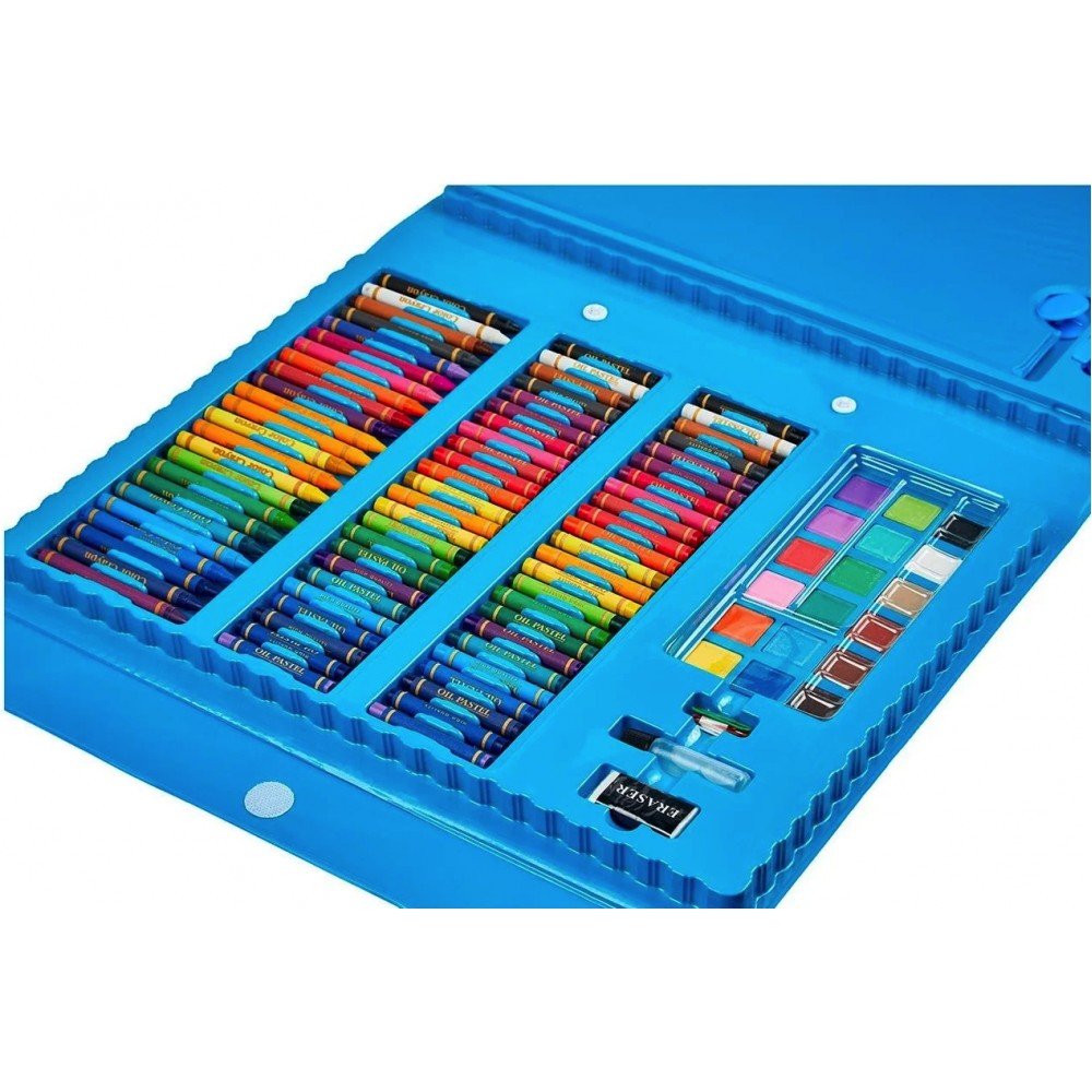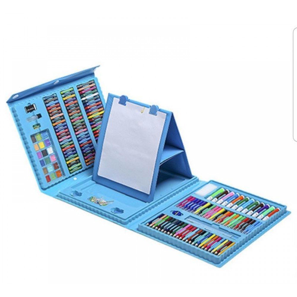 Детский набор для рисования на 208 предметов - прекрасный подарок для ребёнка. Набор для рисования в чемоданчике 208 предметов подарит Вашему ребенку море положительных эмоций. Любовь к различным аксессуарам для рисования, раскрашивания и отражения собственных фантазий на бумаге, проявляется у всех детей, начиная с самого юного возраста. Чемоданчик в виде раскладного кейса продуман до мелочей. Он имеет ячейки, которые хранят в себе все самое необходимое для маленького художника. Каждый предмет сложен в свою ячейку, а это значит, что все будет под рукой и никогда не потеряется. В сложенном виде кейс напоминает чемоданчик, который легко можно использовать как дома, так и в дороге. Кейс раскладывается просто, как книга. Компактный чемоданчик превращается в полноценное удобное рабочее место юного художника. Чемоданчик для рисования удобно хранить и брать с собой. Преимущества: Набор для рисования в чемоданчике; Приучает к аккуратности и дисциплине, улучшает мелкую моторику рук, тренирует внимательность; Практичный и прочный чемоданчик для безопасного хранения и перемещения; Ячейки набора эргономичны – группы предметов разделены на секции; Этот мобильный художественный набор понравится не только детям, но и их родителям; Набор юного художника для детского творчества станет отличным подарком для детей;Характеристики: Назначение: набор для творчества; Вес: 2.2 кг Комплектация: 208 предметов Цвет: Голубой.Комплектация художественного набора: 12 толстых фломастеров; 24 тонких фломастеров; 48 пастель масляная; 24 цветные мелка; 24 цветных карандаша; 18 акварельных красок; 15 листов для рисования; 30 скрепок; 4 зажима для мольберта; 1 простой карандаш; 1 ластик; 1 точилка; 1 палитра; 1 клей; 1 линейка; 1 кисточка; 1 губка; 1 мольберт для рисования.