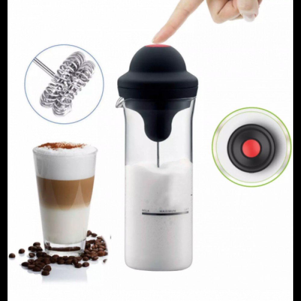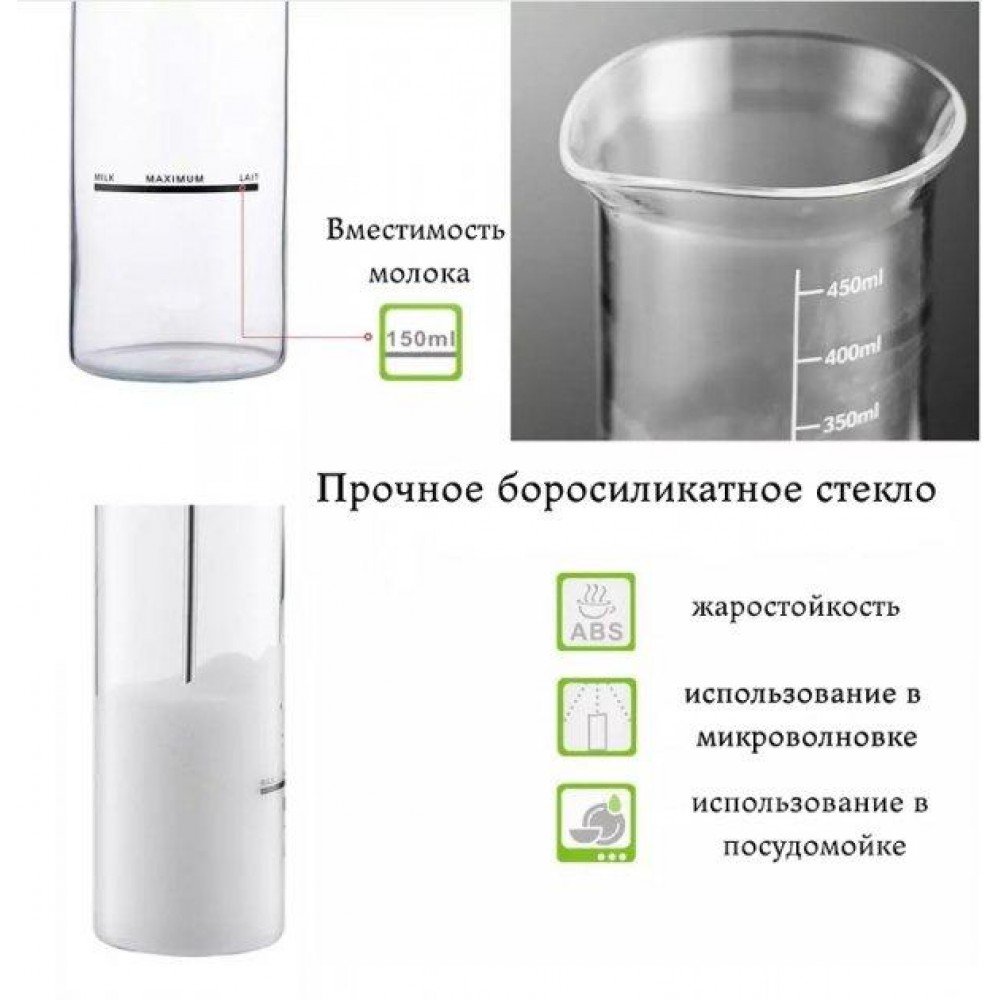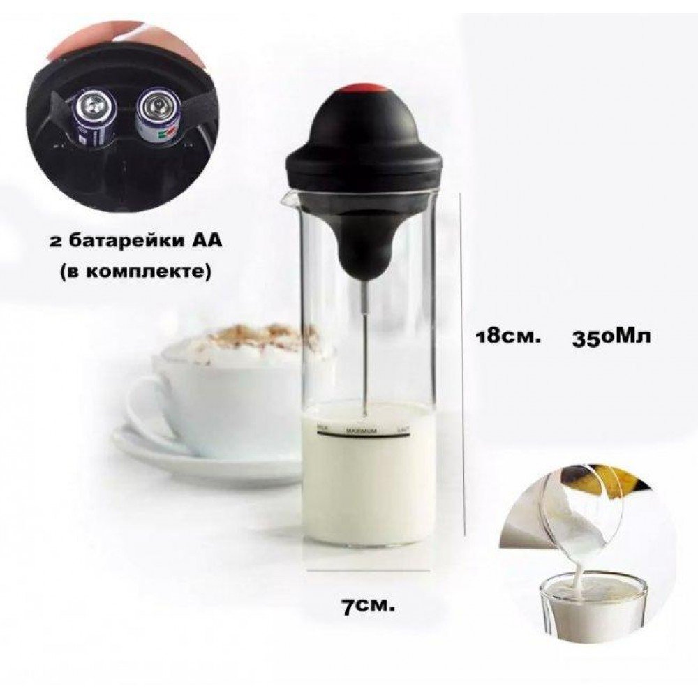 Вспениватель молока, стакан для молочных коктейлей Milk Frother позволит за несколько секунд приготовить молочную пенку. Теперь для вас не составит труда сделать пышную и стойкую пену для капучино или латте или фраппе или порадовать своих домашних нестандартной подачей молока. Особенно такой способ очень нравится детям. За ним удобно ухаживать, он легок во время чистки, не скользит в руках и его легко найти среди другой кухонной технике, когда он срочно нужен. Кроме этого вы можете вспенивать в отдельной чаше, которая сделана под капучинатор из жаростойкого стекла. Так же вы можете в чаше подогревать молоко в микроволновке и без труда чистить в посудомойке.Особенности:Быстро Получите Creamy FROTH: Если вы любите утренний кофе с большим количеством пены, то вам наверняка захочется иметь вспениватель Milk Frother у себя дома или капучино в стиле кафе.Двойной венчик изготовлен из высококачественной нержавеющей стали. Безопасный для пищевых продуктов материал венчик из нержавеющей стали, который не ржавеет и не ломается с течением времени, обеспечивает удвоенную мощность. Кнопка включения сверху облегчает использование. Малошумный мотор едва издает звук.Этот Пеносбиватель для кофе с двойной пружиной способен сделать молочко в течение 5-15 секунд или меньше. Идеальная Молочная машина для кофе, латте, капучино, горячего шоколада, эспрессо, миндального молока. Он будет хорошо работать как с горячими, так и с холодными жидкостями.Портативный для путешествий наш Миксер для кофе с палочкой оснащен двойной головкой венчика, более мощным и эффективным, отвечает различным потребностям. Освежите себя холодным, теплым молоком, чтобы сделать капучино, латте, эспрессо и многое другое.Нажмите кнопку в считанные секунды, чтобы насладиться Кремовым кофе. Положите венчик для взбивания молока в горячую воду и нажмите кнопку и он максимально очиститься. Стеклянный кувшин безопасно чистить в посудомоечной машине. Он жаростойкий. Так же в него можно наливать любую жидкость до 450мл. для подогрева в микроволновой печи.Кувшин для молока изготовлен из прочного, термостойкого боросиликатного стекла. Эта стеклянная посудина легко моеться.Цвет: черный + прозрачныйСкорость двигателя: 19000 об/минМатериалы: стекло + ABS + нержавеющая стальПитание: 2 батарейки типа АА (в комплекте)Емкость (15 унций/450 мл.) Характеристики:Время: вспенивает молоко за 5-15 секундМатериал: двойная палочка из нержавеющей сталиПитание: 2 батарейки АА (в комплекте) Комплектация:1.Миксер;2.Насадка венчик для взбивания молока.3.Чаша