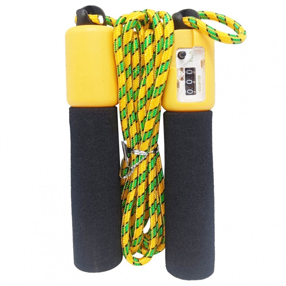 Скакалка спортивная со счетчикомМатериал ручек: пластик с мягким покрытиемМатериал веревки: нейлонДлина веревки: 280 смСчетчик механический, встроенный в ручку скакалки, подсчитывает количество прижков- оборотов. Легко регулируемая длина веревки.